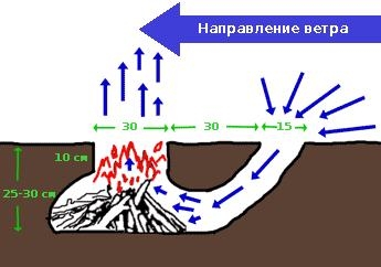 Сопровождающая иллюстрация раскрывает секрет высокой эффективности подземного очага. Когда горит огонь, выделяется горячий воздух, который уходит вверх через «дымоход». Таким образом создаётся всасывающий момент, который принудительно втягивает воздух через туннель к основанию костра. Тяга значительно увеличивается, если вы прорыли туннель с наветренной стороны. Под бушующим притоком воздуха, пламя постоянно раздувается, что делает костёр более жарким и эффективным. Чем жарче пламя, тем меньше дыма. Кроме того, самая горячая (верхняя) часть пламени концентрируется на выходе из «дымохода», что даёт возможность делать больше полезной работы, используя меньше дров — потрясающее свойство для выживания в экстремальных ситуациях.